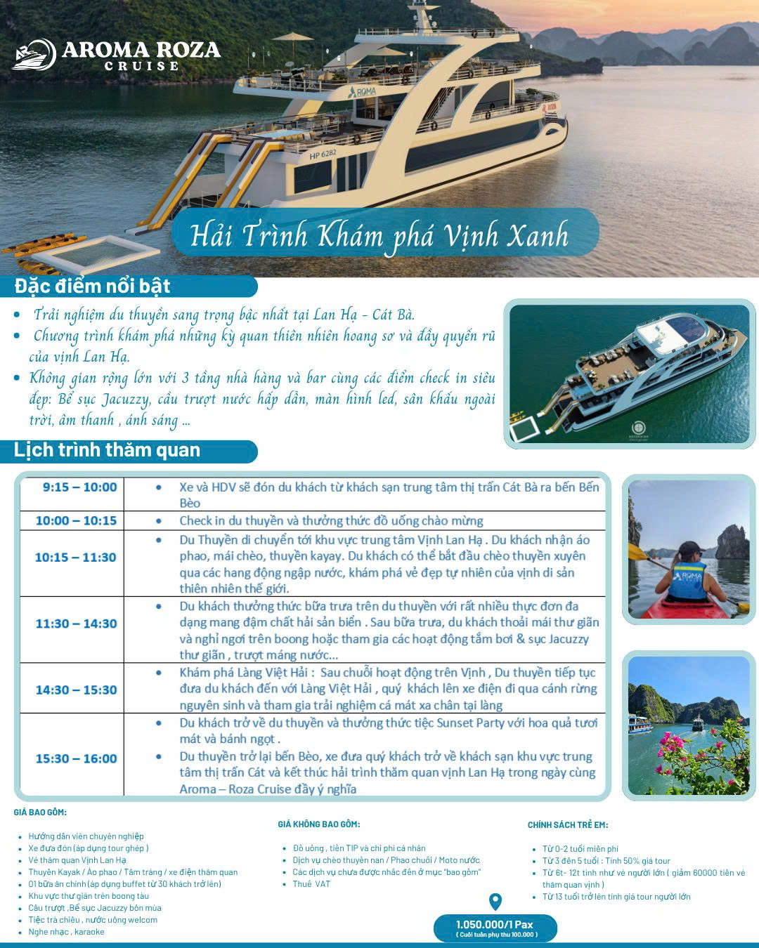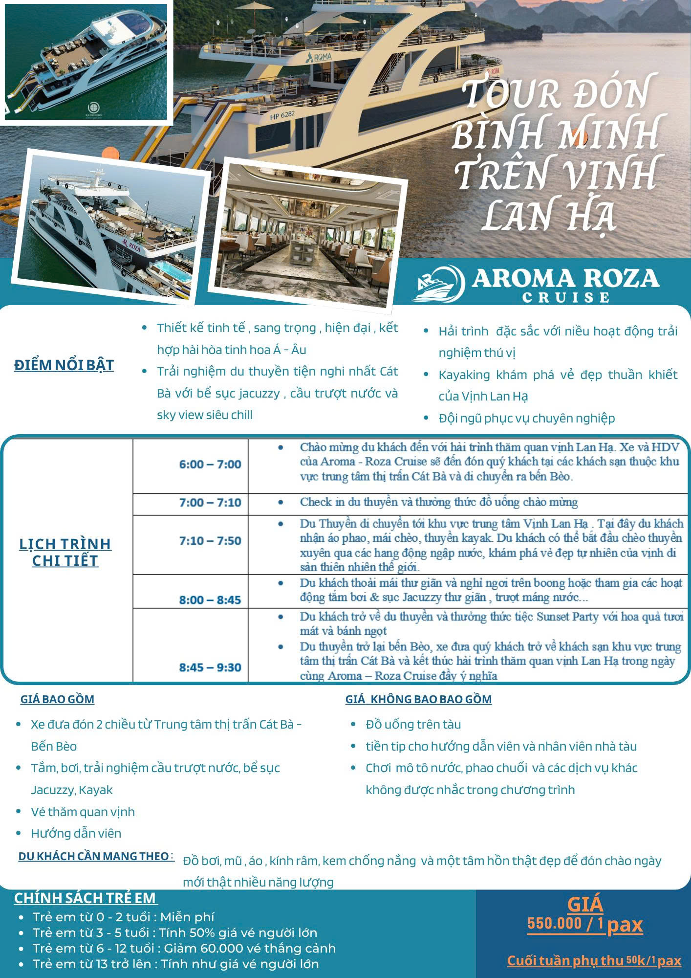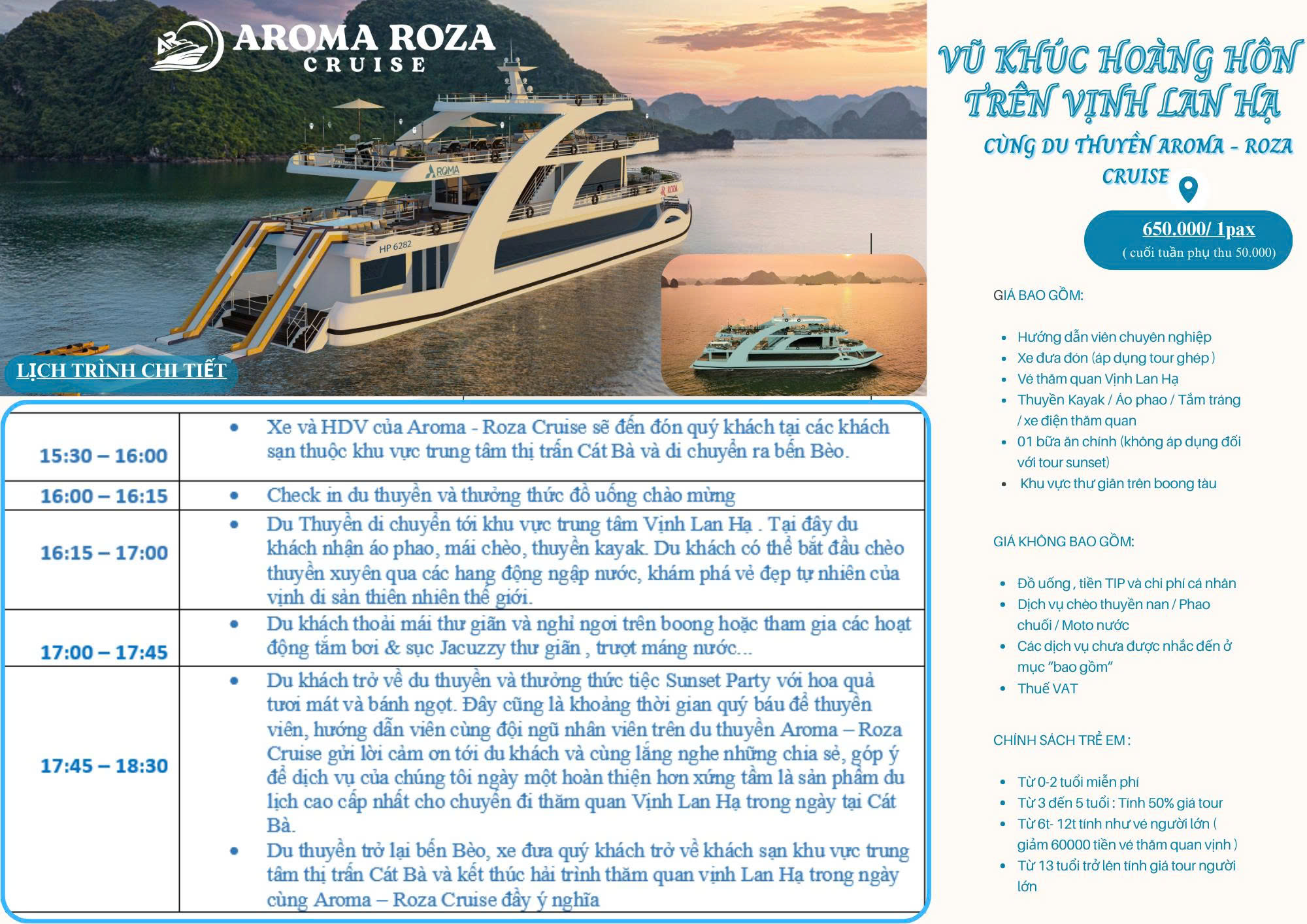 Với sức chứa lên đến 100 khách, du thuyền Aroma Roza Cruise là sự kết hợp hoàn hảo giữa không gian sang trọng, dịch vụ chuyên nghiệp và những trải nghiệm độc đáo trên vùng Vịnh Lan Hạ tuyệt đẹp.
