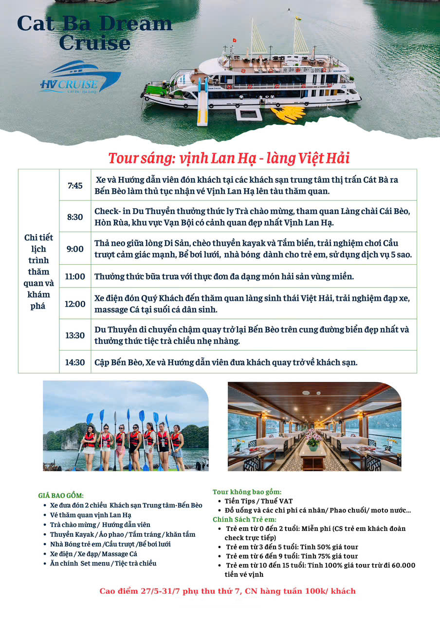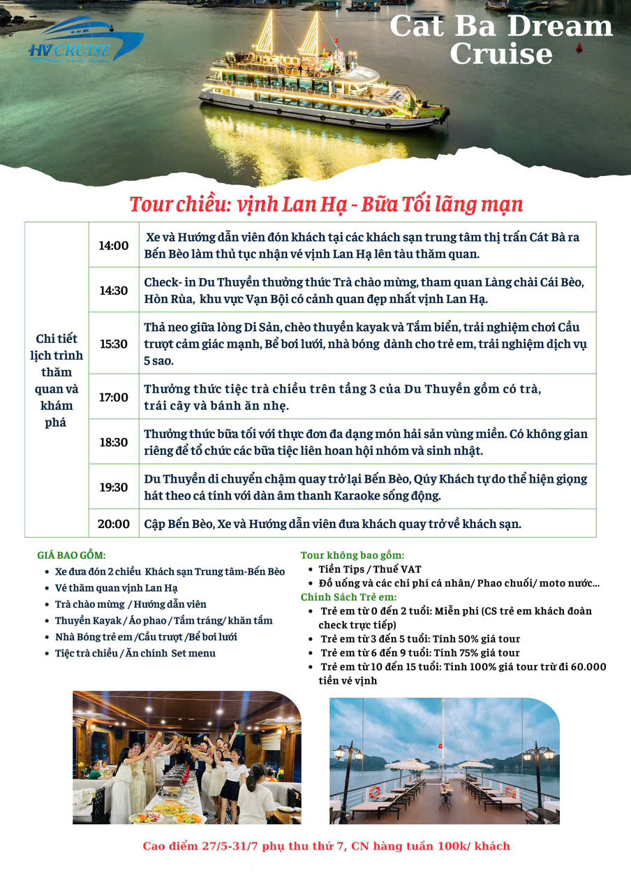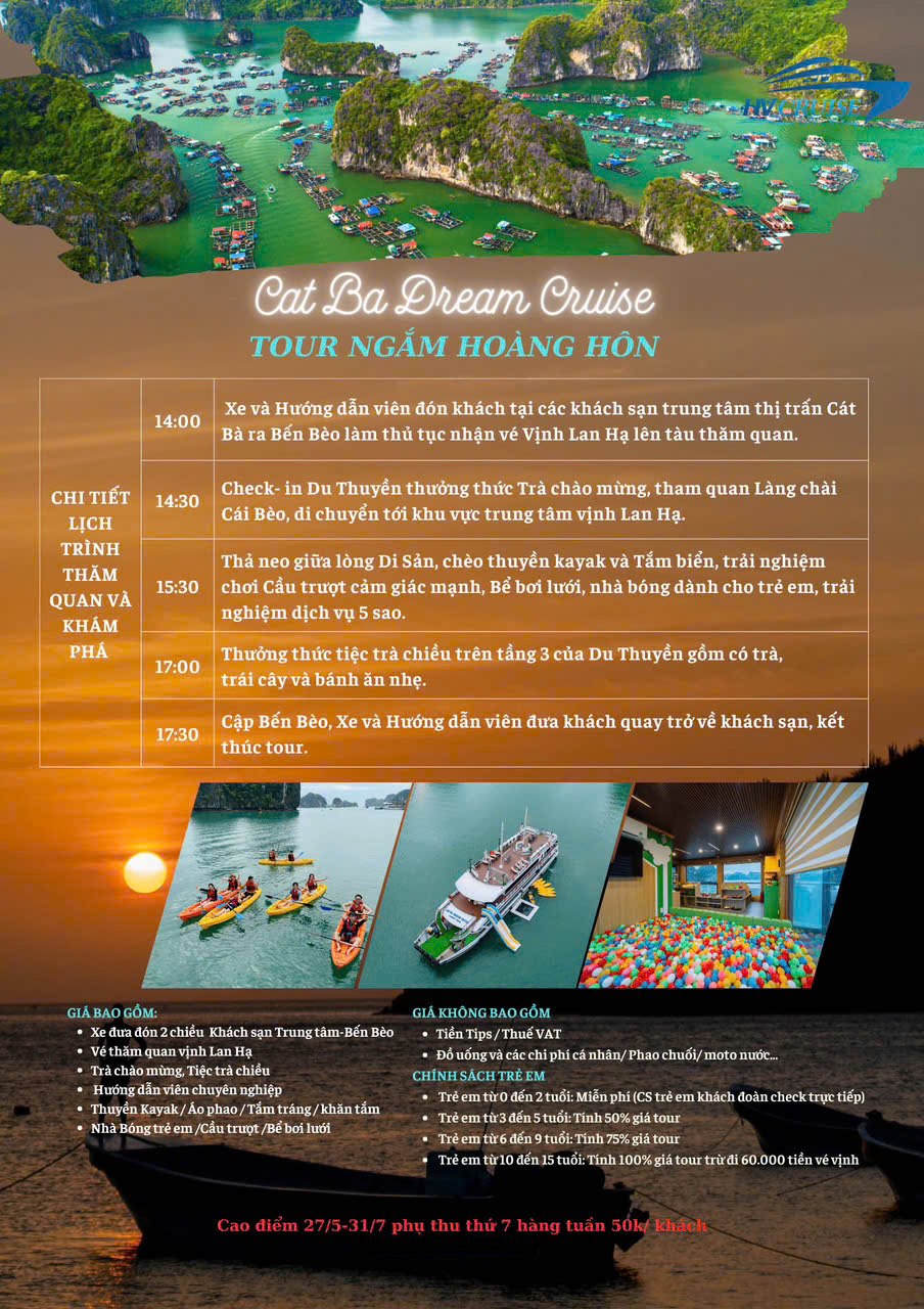 Các tour hàng ngày của du thuyền Cát Bà Dream Cruise gồm có Tour một ngày, Tour hoàng hôn và Tour hoàng hôn kèm ăn tối trên vịnh Lan Hạ.