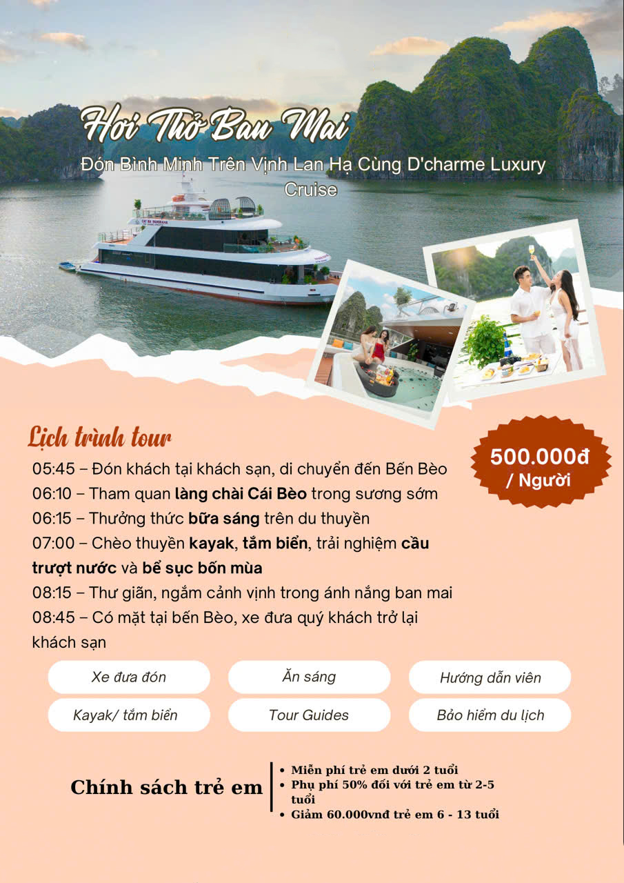 Tour tham quan vịnh Lan Hạ - Làng chài Việt Hải một ngày, Tour Hoàng Hôn được Du Thuyền D'Charme Luxury Cruises tổ chức tất cả các ngày trong tuần để phục vụ nhu cầu của du khách.