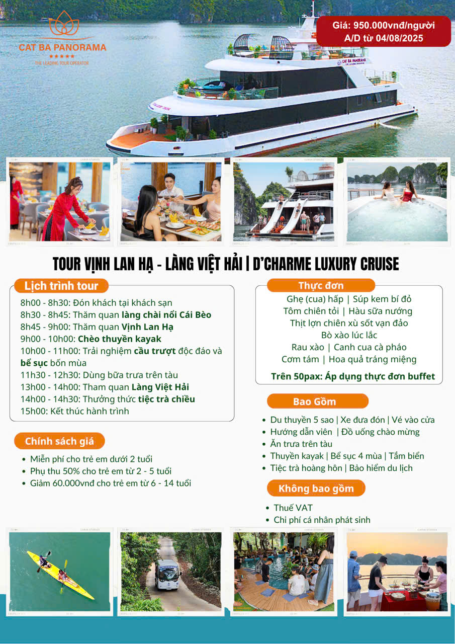 Cát Bà Panorama Travel vừa cho ra mắt du thuyền D'Charme Luxury Cruises. Đây là du thuyền 5 sao với phong cách thiết kế sang trọng, hiện đại. Mỗi du thuyền đều có tầng ăn, nghỉ và tầng thư giãn, ngắm cảnh riêng, tạo cho du khách những trải nghiệm ấn tượng trong suốt hành trình.