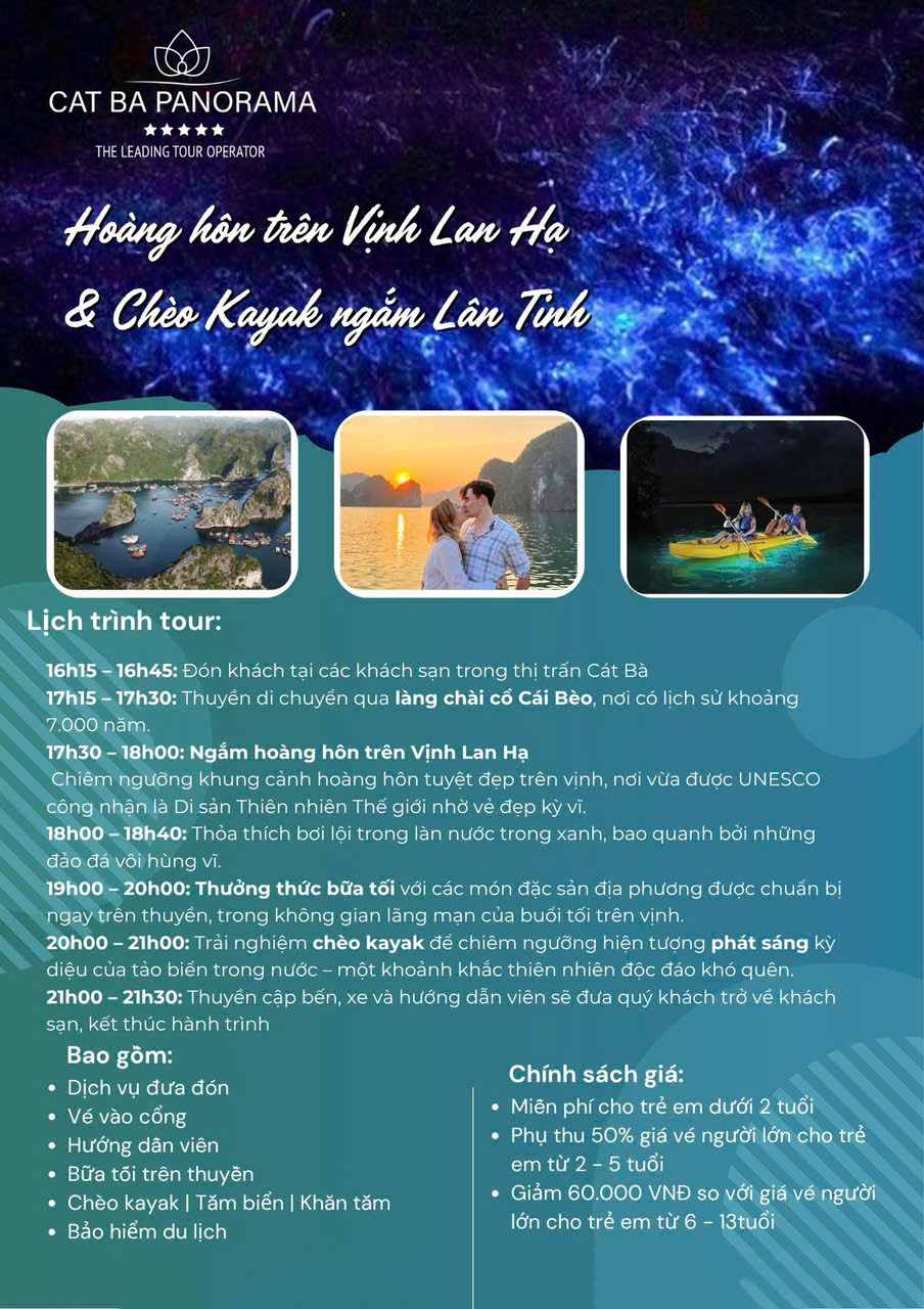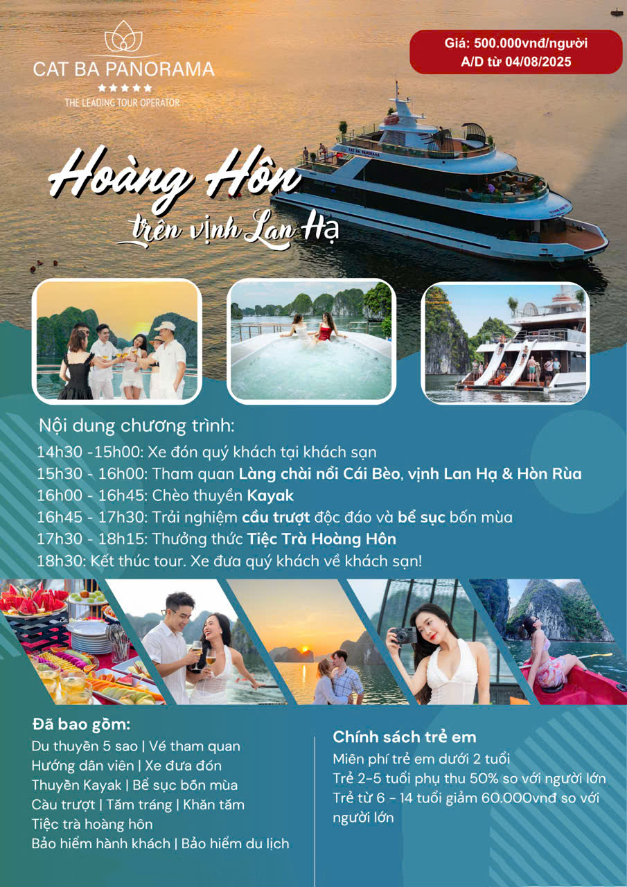 Cát Bà Panorama Travel là hãng tour du thuyền trong ngày chuyên nghiệp, uy tín tại Cát Bà. Các tour vịnh Lan Hạ của Cát Bà Panorama luôn được du khách đánh giá cao về chất lượng và phong cách phục vụ.