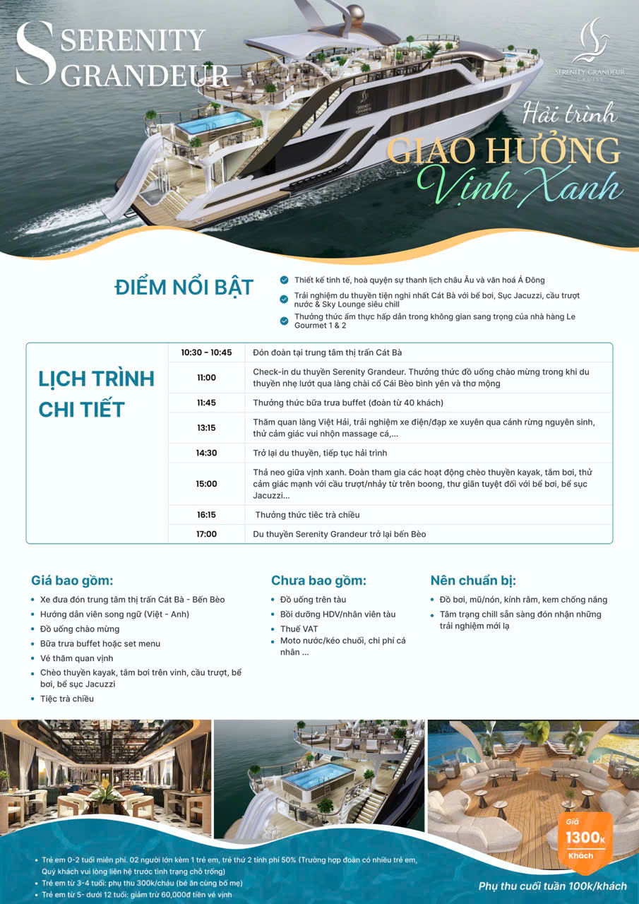 Du thuyền Serenity Grandeur Cruise là du thuyền 5 Sao mới nhất và hoành tráng nhất tại Cát Bà. Du thuyền Serenity Grandeur Cruise được đầu tư đóng mới tháng 6 năm 2025 có sức chứa 200 khách.