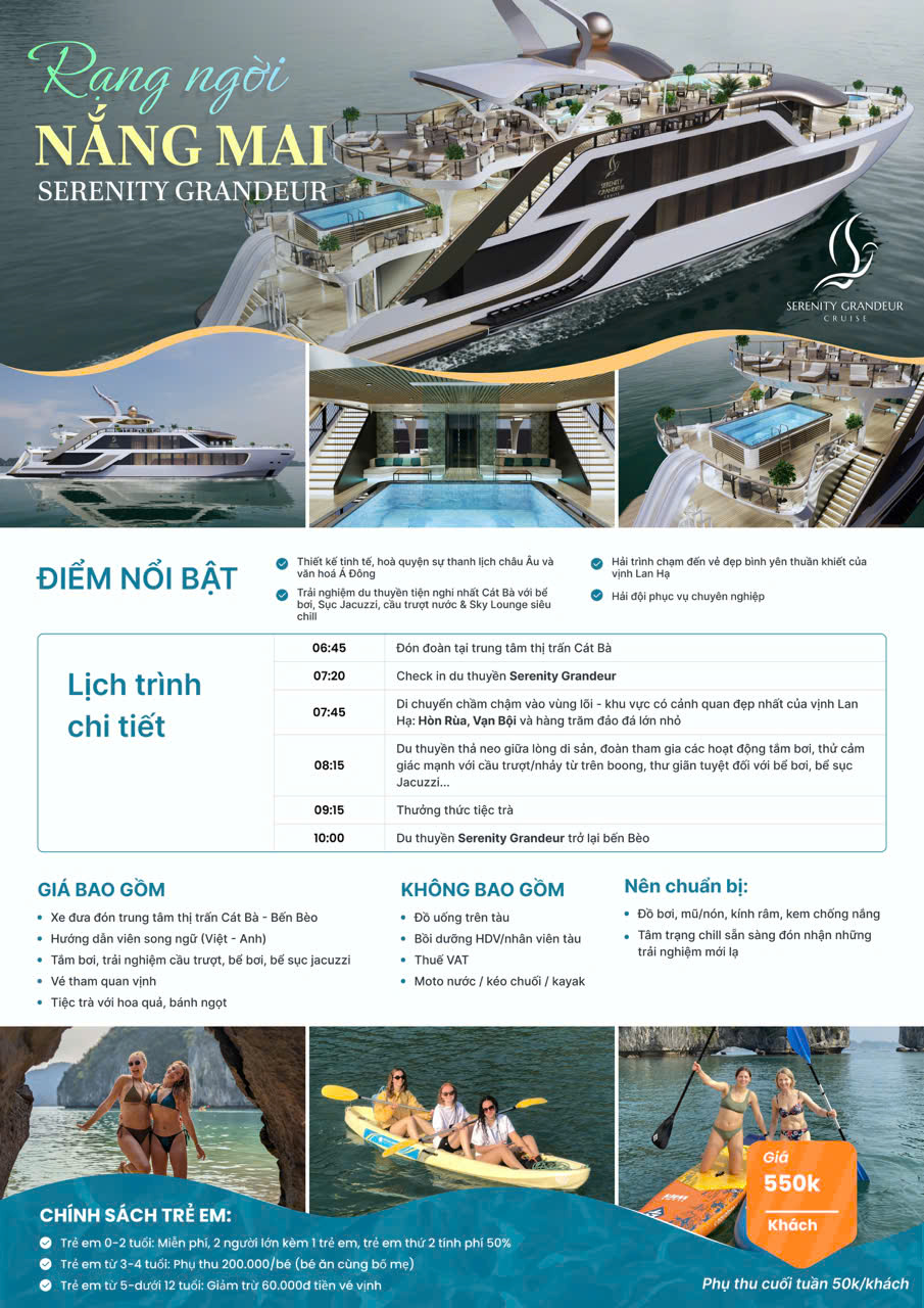 Tour ngắm bình minh và tour tham quan vịnh Lan Hạ một ngày được du thuyền Serenity Grandeur Cruise tổ chức hàng ngày để phục vụ nhu cầu của du khách.