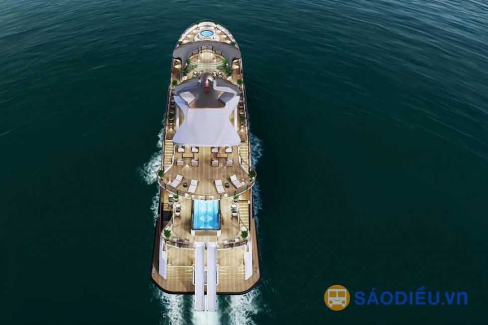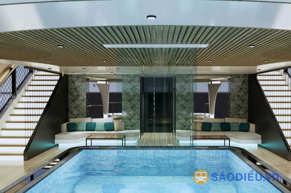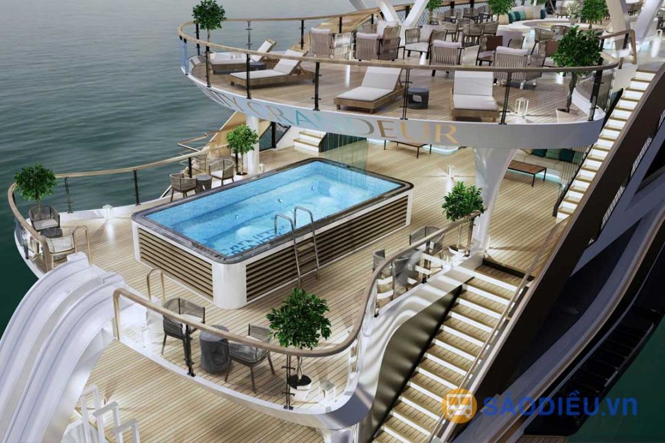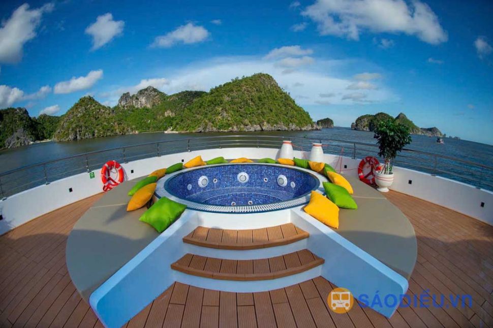 Du thuyền duy nhất hiện nay có cả ba khu vực tắm thư giãn: Bể sục, bể bơi trên boong và bể bơi phao khí khổng lồ giữa vịnh.