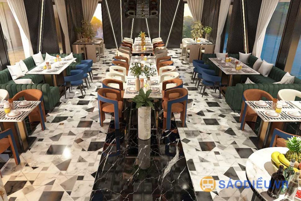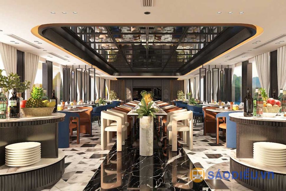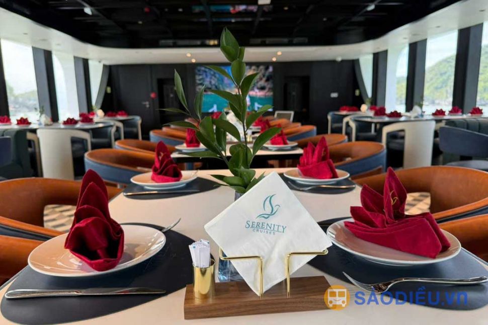 Serenity Grandeur Cruise được thiết kế theo phong cách hiện đại với tông màu trắng thanh lịch, hiện đại bậc nhất. Toàn cảnh du thuyền tựa như khách sạn nổi trên biển đầy nổi bật và tinh tế với tổng cộng 3 tầng. Khu vực nhà hàng tại tầng 1, tầng 2 được thiết kế khép kín với các ô cửa kính lớn. Đây là nơi lý tưởng để quý khách thưởng thức những bữa trưa tuyệt vời giữa khung cảnh tuyệt đẹp của vịnh Lan Hạ.