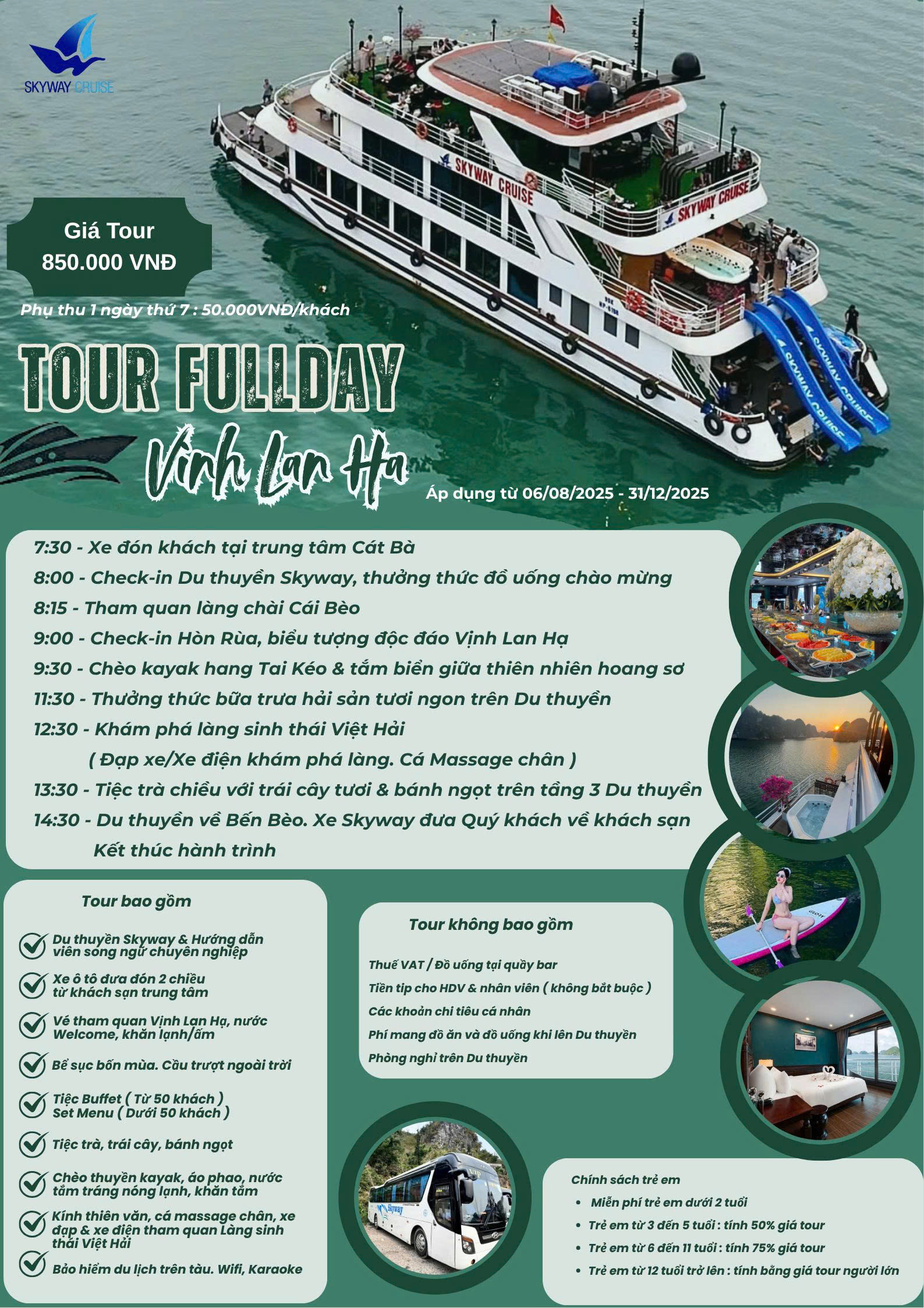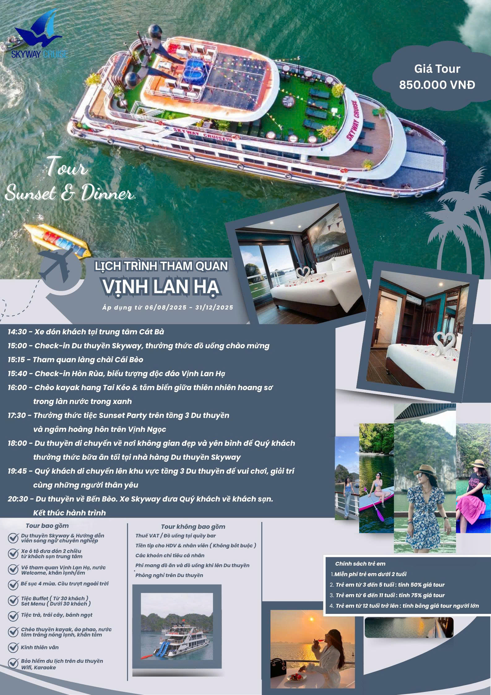 Các tour hàng ngày của du thuyền Sky Way Cruise gồm có Tour một ngày, Tour hoàng hôn, Tour ngắm hoàng hôn và ăn tối trên vịnh Lan Hạ.