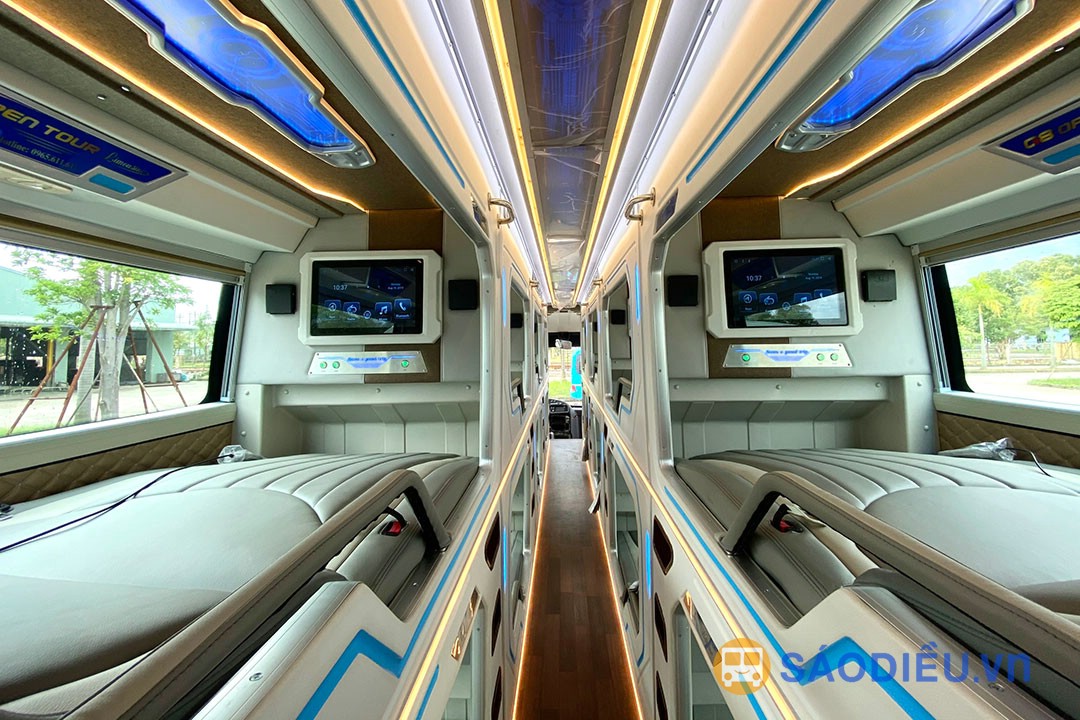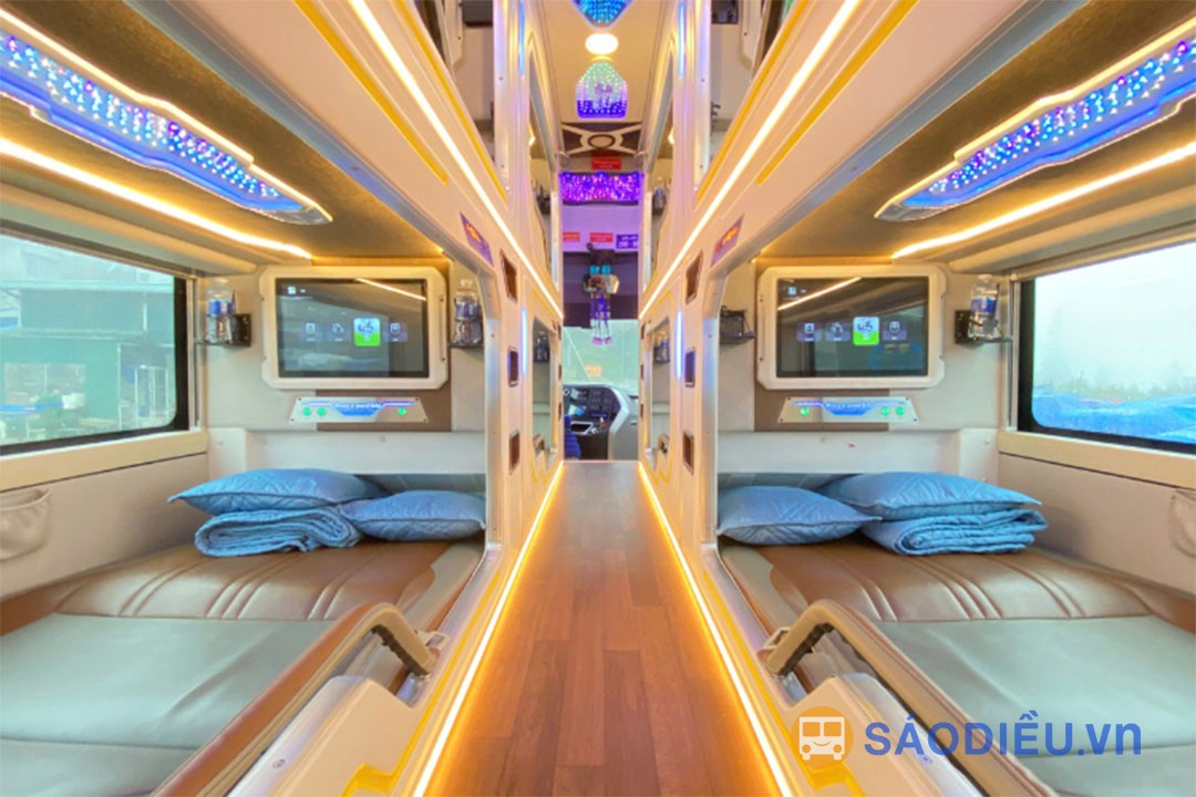 Ngoài những tiện nghi thông thường như: điều hoà, chăn đắp, nước uống, wifi, mỗi cabin còn được trang bị hệ thống Massage, đèn đọc sách, hộp đựng đồ, cổng sạc USB và hệ thống giải trí với màn hình LCD 17 inch, tai nghe và hàng trăm nội dung HD sẵn có cho hành khách chọn lựa.
