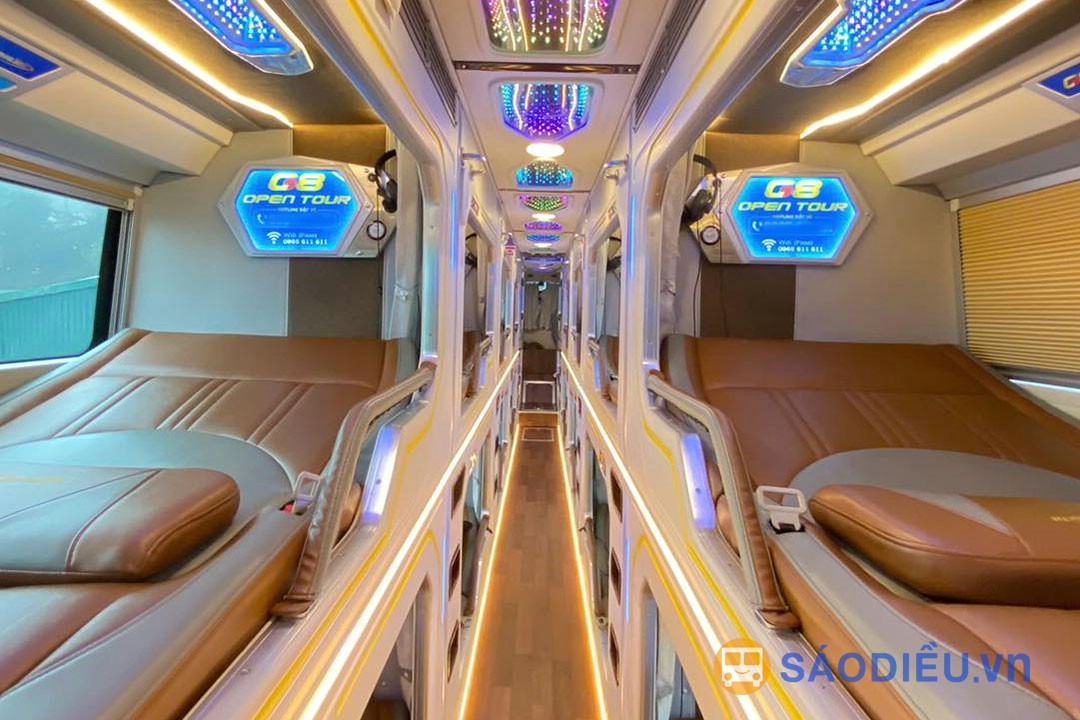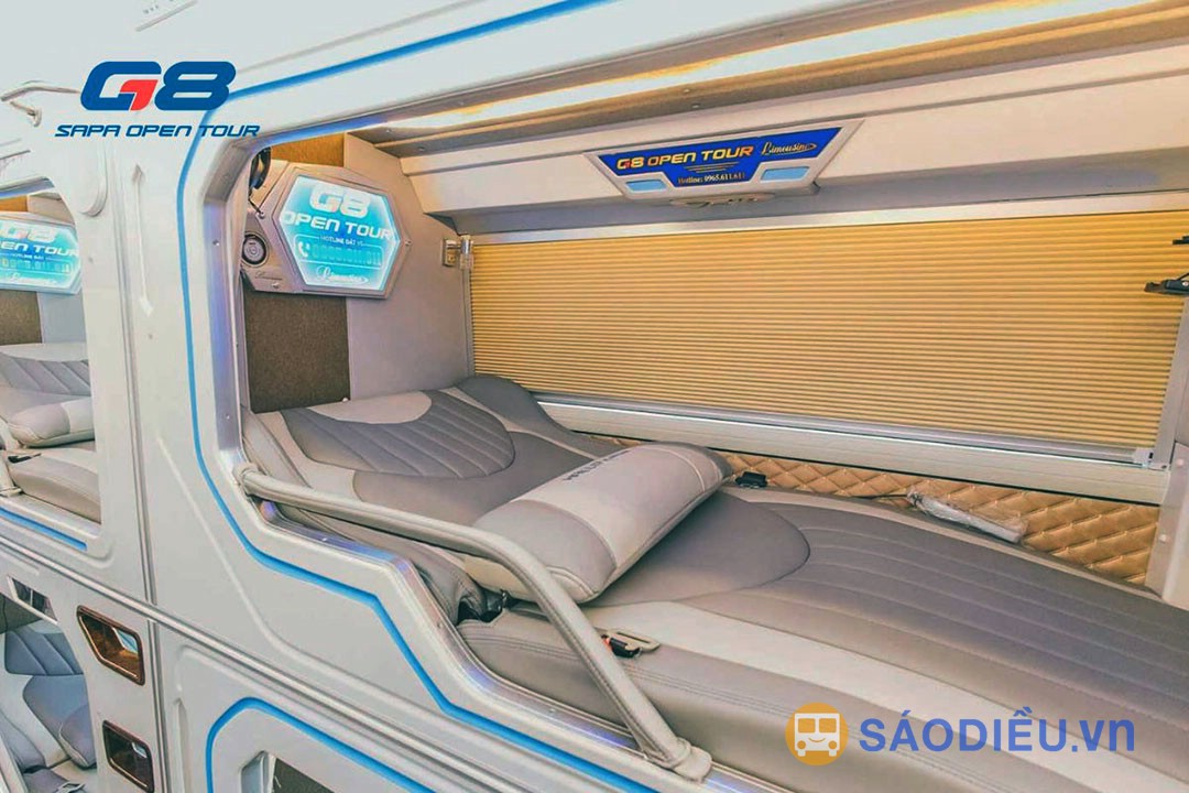 Xe G8 - Sapa Open Tour đi Sapa là loại xe giường phòng 22 Cabin. Xe có 10 Cabin đôi tầng 1 (tầng trệt) và 12 Cabin đơn tầng 2. Giường của các Cabin có kích thước siêu rộng, được bọc da toàn bộ và có thể điều chỉnh nghiêng hoặc ngả phẳng hoàn toàn. Mỗi cabin được thiết kế như một khách sạn thu nhỏ với cửa sổ kính view rộng toàn cảnh, có rèm và vách ngăn ngăn cách giữa các cabin, tạo cảm giác vừa rộng rãi, thoải mái, vừa riêng tư cho du khách.