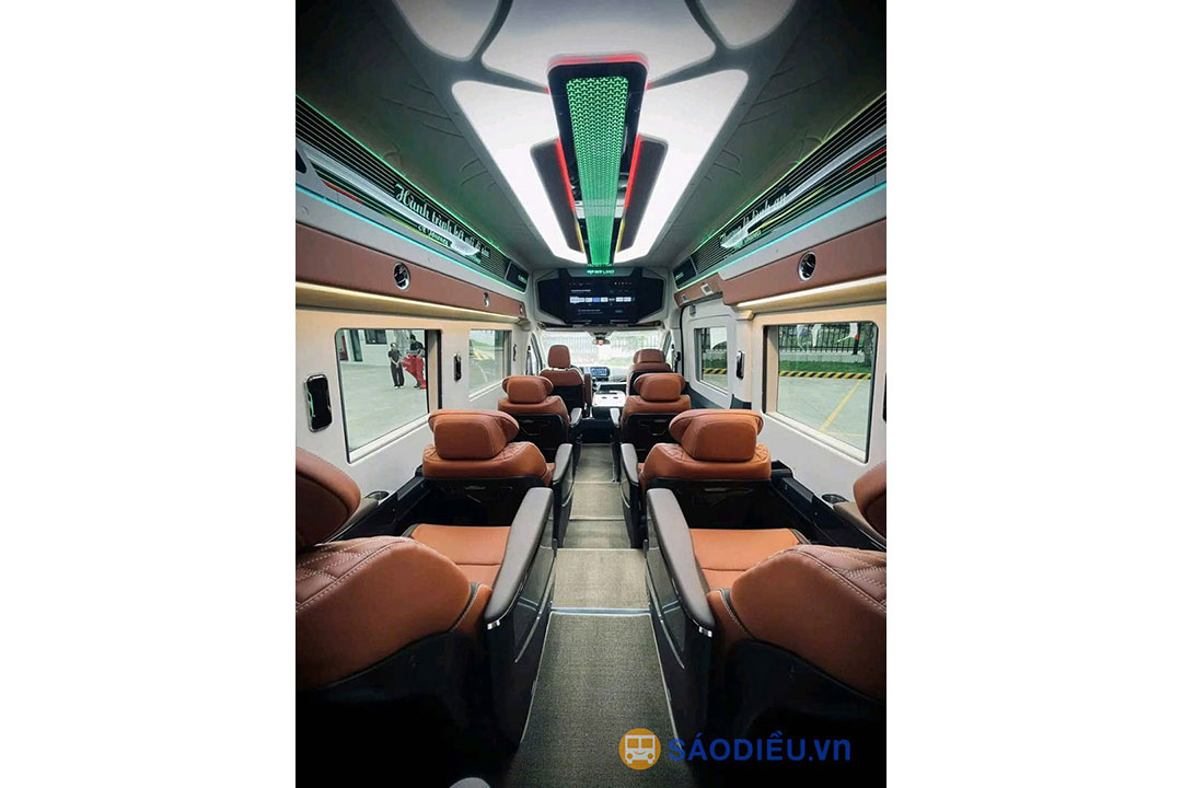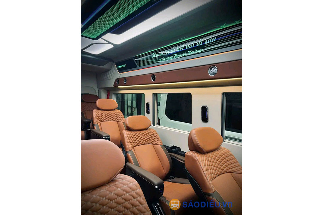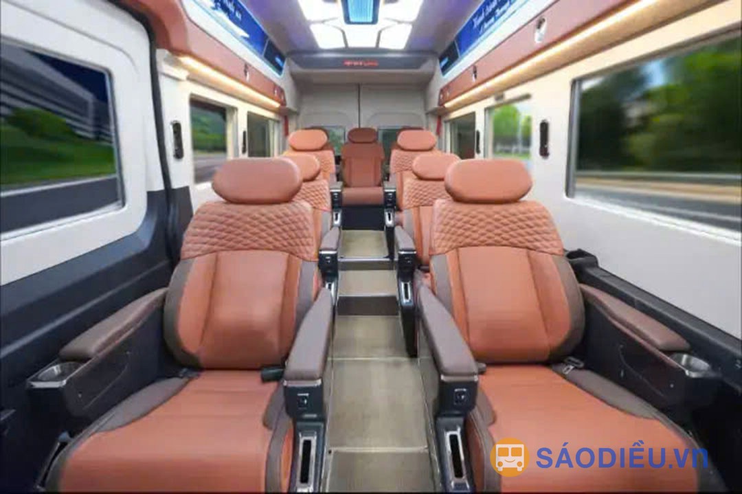 Hãng xe Phan Travel đi Hà Giang là dòng xe Limousine được thiết kế từ xe Transit và Solati 16 chỗ thông thường, cho không gian sử dụng rộng rãi, đảm bảo sự thư giãn, thoải mái tối đa. Xe có 11 ghế bọc da cao cấp với 2 ghế đầu xe và 7/9 ghế hạng thương gia ở khoang sau. Nội thất xe được ốp gỗ, trần xe với hệ thống đèn LED giọt nước, đèn bầu trời sao kiểu Rolls Royce góp phần mang lại sự thư giãn tối đa cho hành khách.