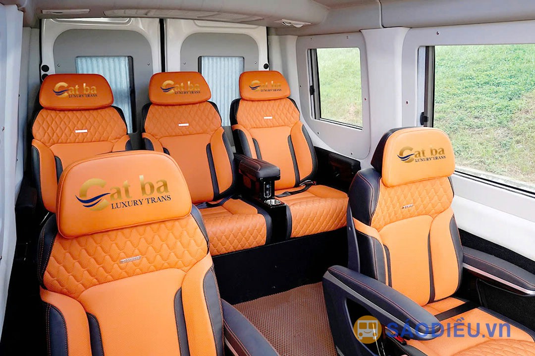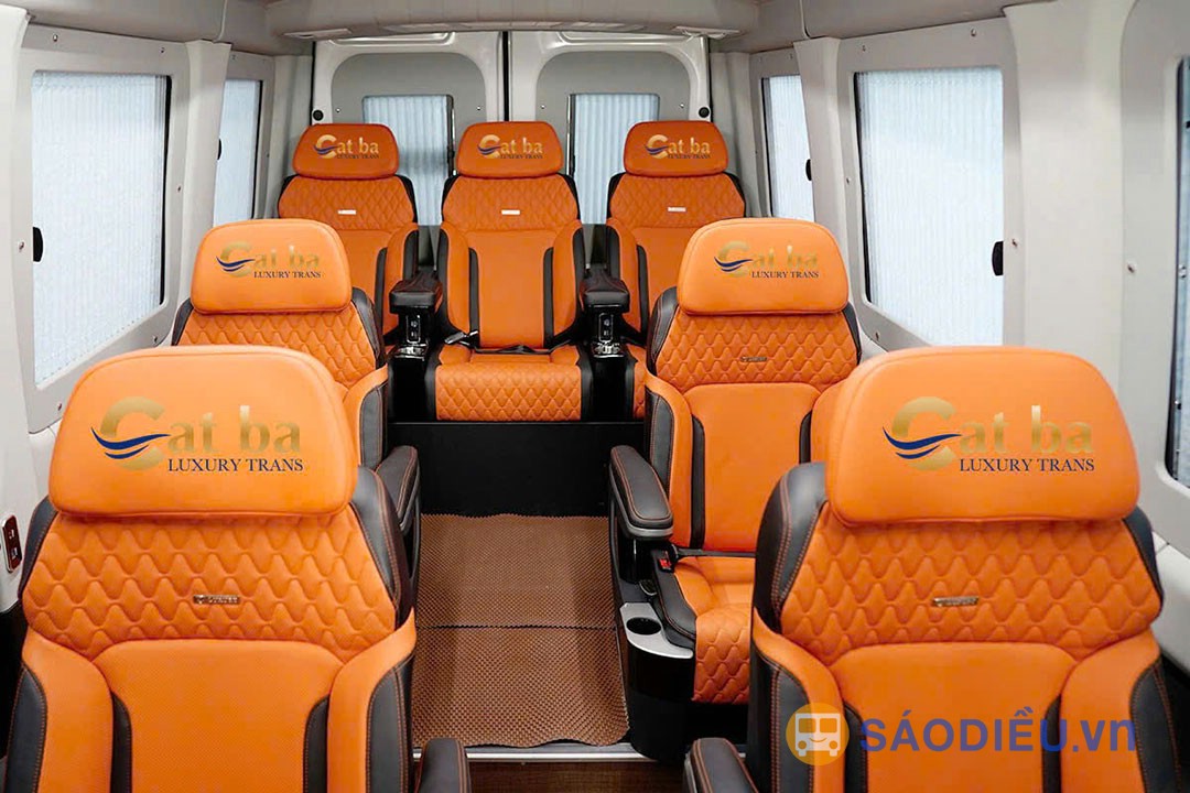 Xe Cát Bà Limousine sử dụng dòng xe Limousine 09 chỗ đời mới. Xe có thiết kế 9 ghế bọc da cao cấp với không gian rộng rãi, thoáng mát. Các ghế có bệ tì tay, gối đỡ chân và tựa lưng điều khiển điện. Trên xe trang bị đầy đủ các tiện nghi hiện đại như: Wifi tốc độ cao, cổng sạc USB mỗi ghế, chăn đắp, khăn lạnh và nước uống miễn phí.