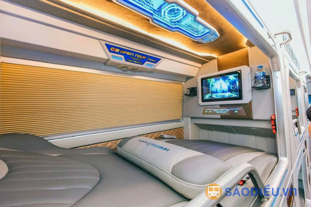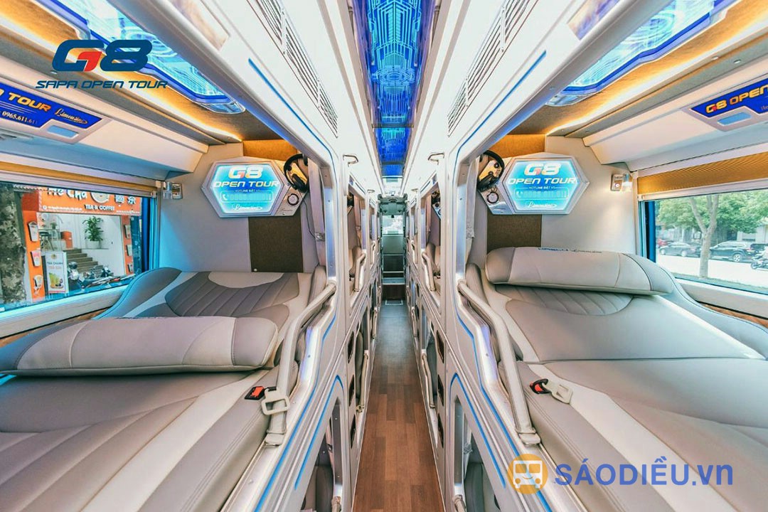 Xe G8 - Sapa Open Tour đi Sapa là loại xe giường phòng 22 Cabin. Xe có 10 Cabin đôi tầng 1 (tầng trệt) và 12 Cabin đơn tầng 2. Giường của các Cabin có kích thước siêu rộng, được bọc da toàn bộ và có thể điều chỉnh nghiêng hoặc ngả phẳng hoàn toàn. Mỗi cabin được thiết kế như một khách sạn thu nhỏ với cửa sổ kính view rộng toàn cảnh, có rèm và vách ngăn ngăn cách giữa các cabin, tạo cảm giác vừa rộng rãi, thoải mái, vừa riêng tư cho du khách.