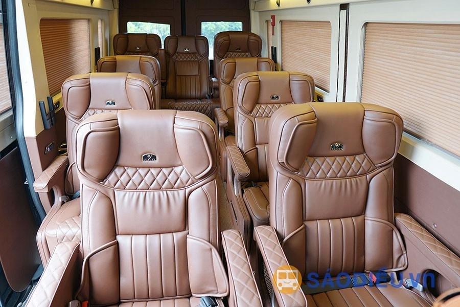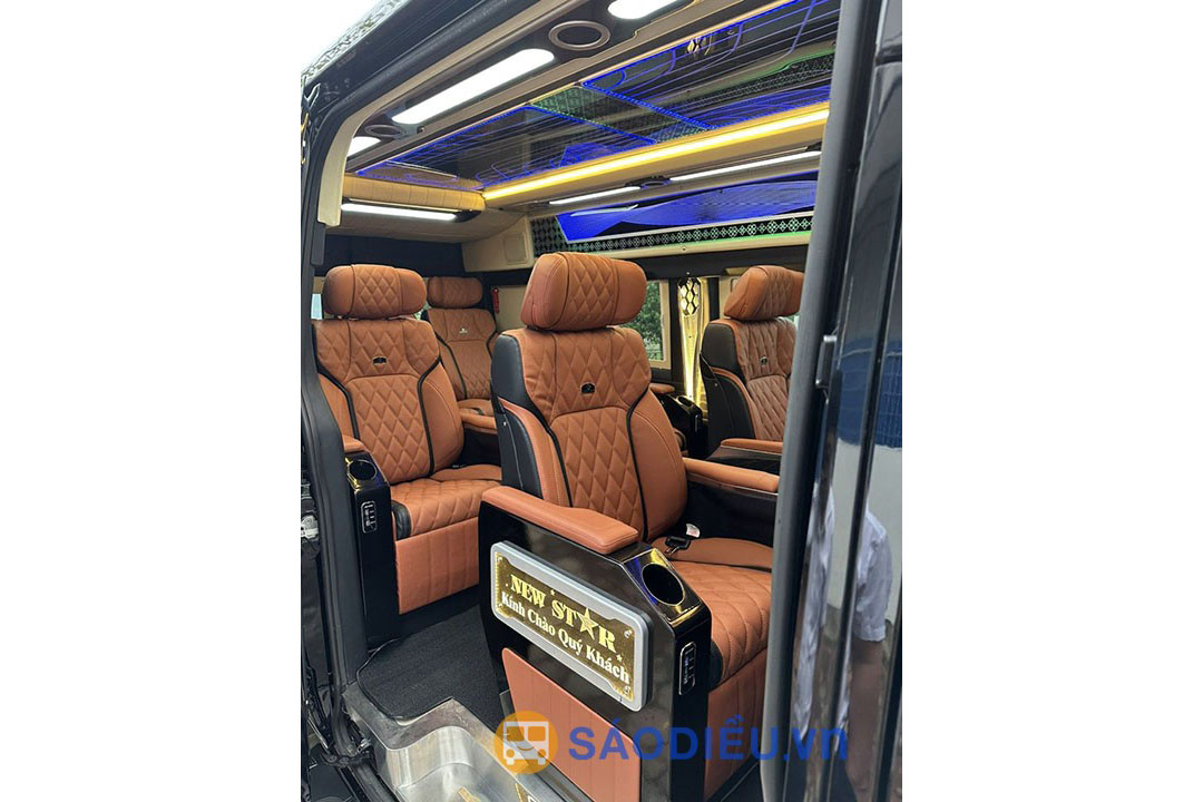 Xe New Star Limousine là loại xe Dcar có thiết kế 9/11 ghế da mềm, rộng rãi, kích thước lớn. Các ghế VIP có bệ để tay, có thể ngả từ 10~45 độ tùy theo nhu cầu. Nội thất xe được thiết kế đồng nhất, sang trọng với vân ốp gỗ, trần sao và các hộc để đồ, để cốc tiện dụng.