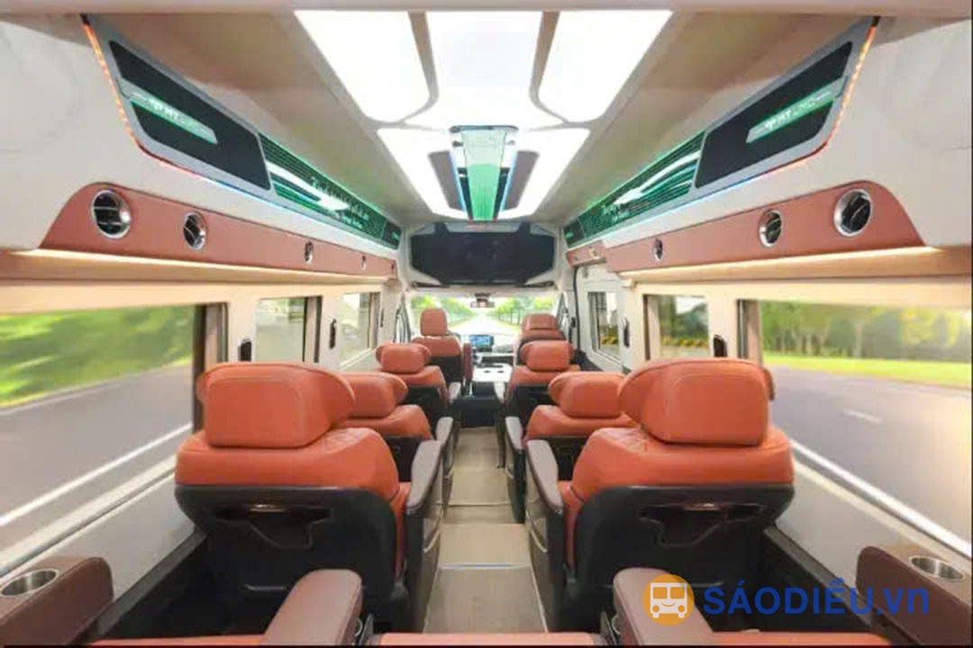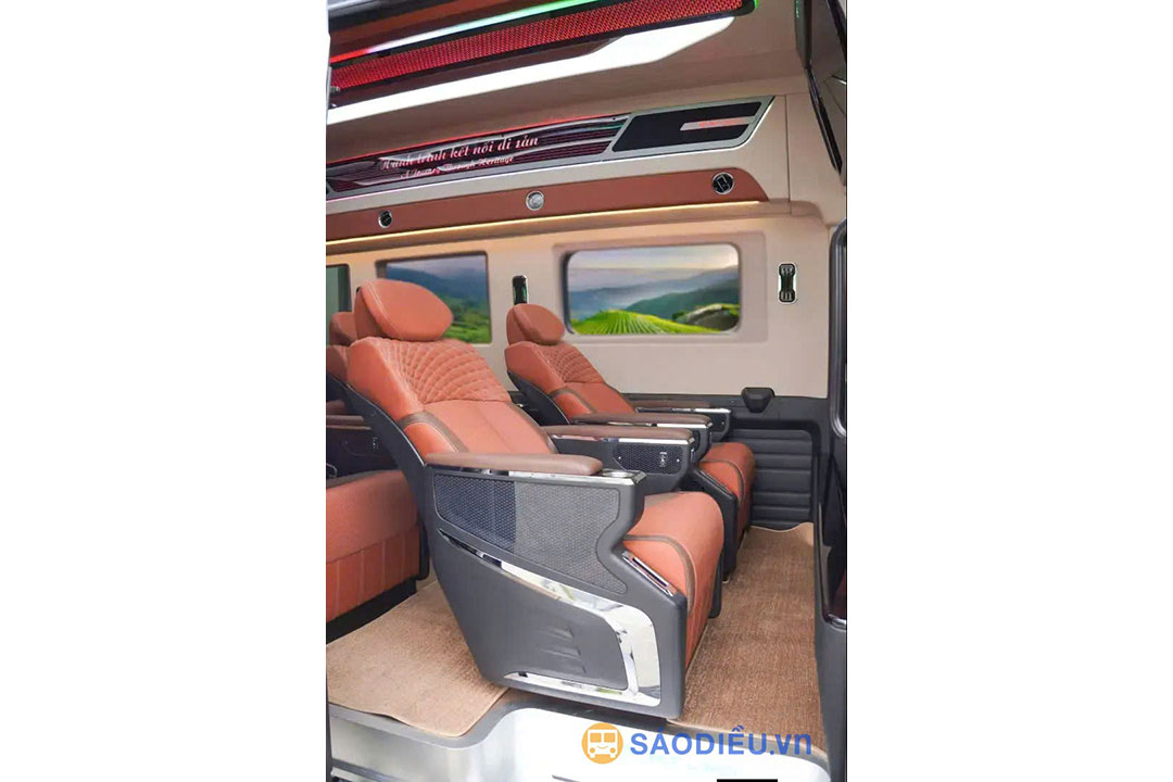 Hãng xe Phan Travel đi Hà Giang là dòng xe Limousine được thiết kế từ xe Transit và Solati 16 chỗ thông thường, cho không gian sử dụng rộng rãi, đảm bảo sự thư giãn, thoải mái tối đa. Xe có 11 ghế bọc da cao cấp với 2 ghế đầu xe và 7/9 ghế hạng thương gia ở khoang sau. Nội thất xe được ốp gỗ, trần xe với hệ thống đèn LED giọt nước, đèn bầu trời sao kiểu Rolls Royce góp phần mang lại sự thư giãn tối đa cho hành khách.