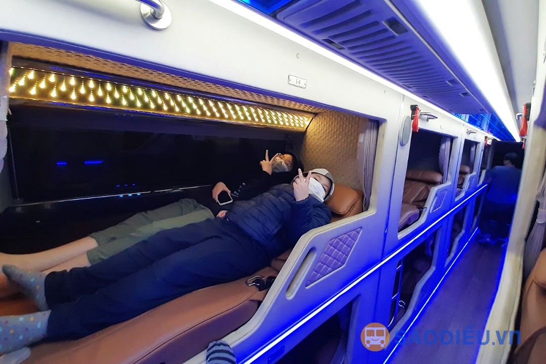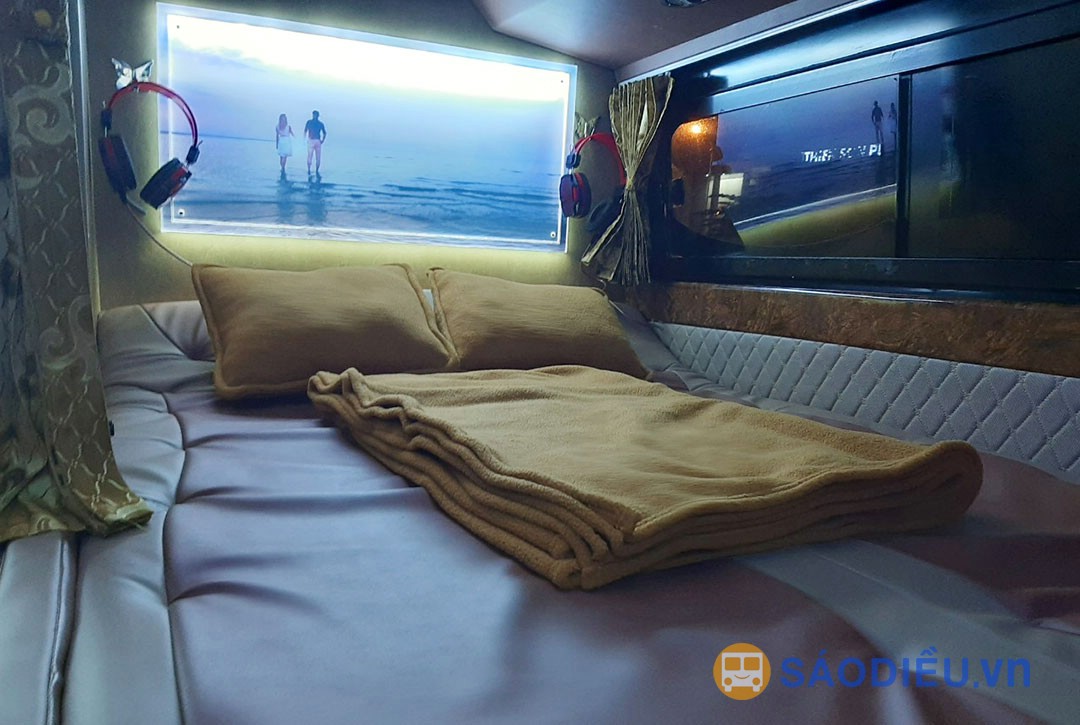 Trên xe trang bị khá đầy đủ tiện nghi như: Điều hòa, Wifi, đèn đọc sách, cổng sạc USB, chăn đắp và nước uống miễn phí.