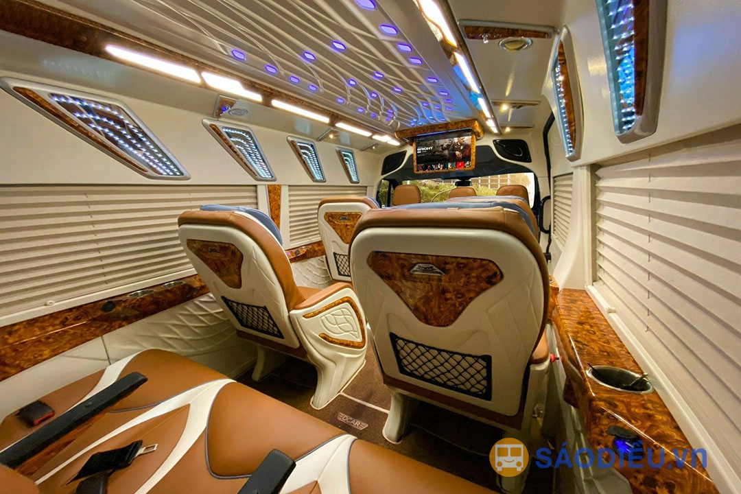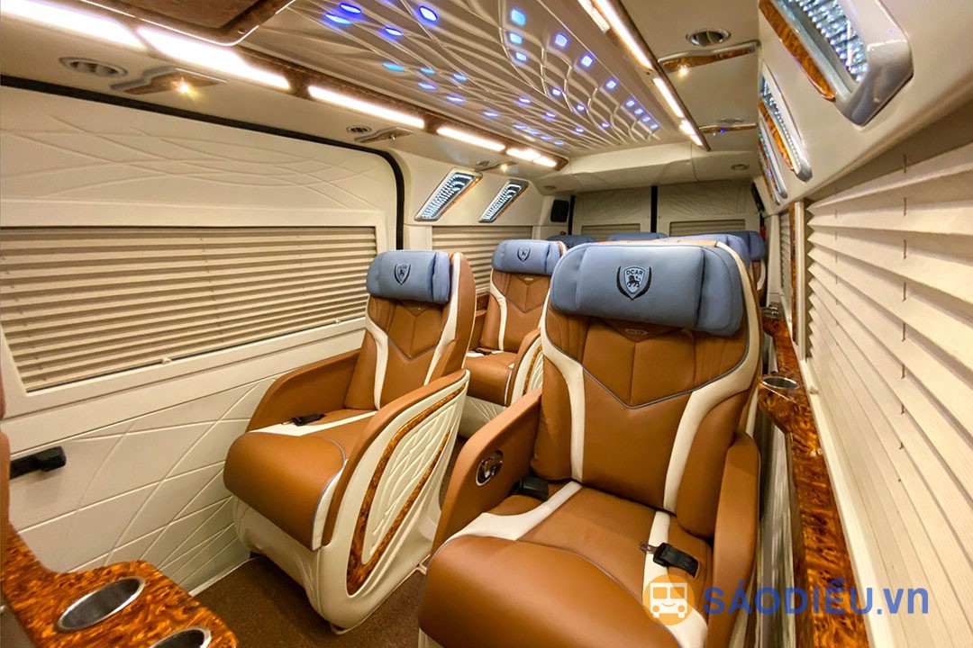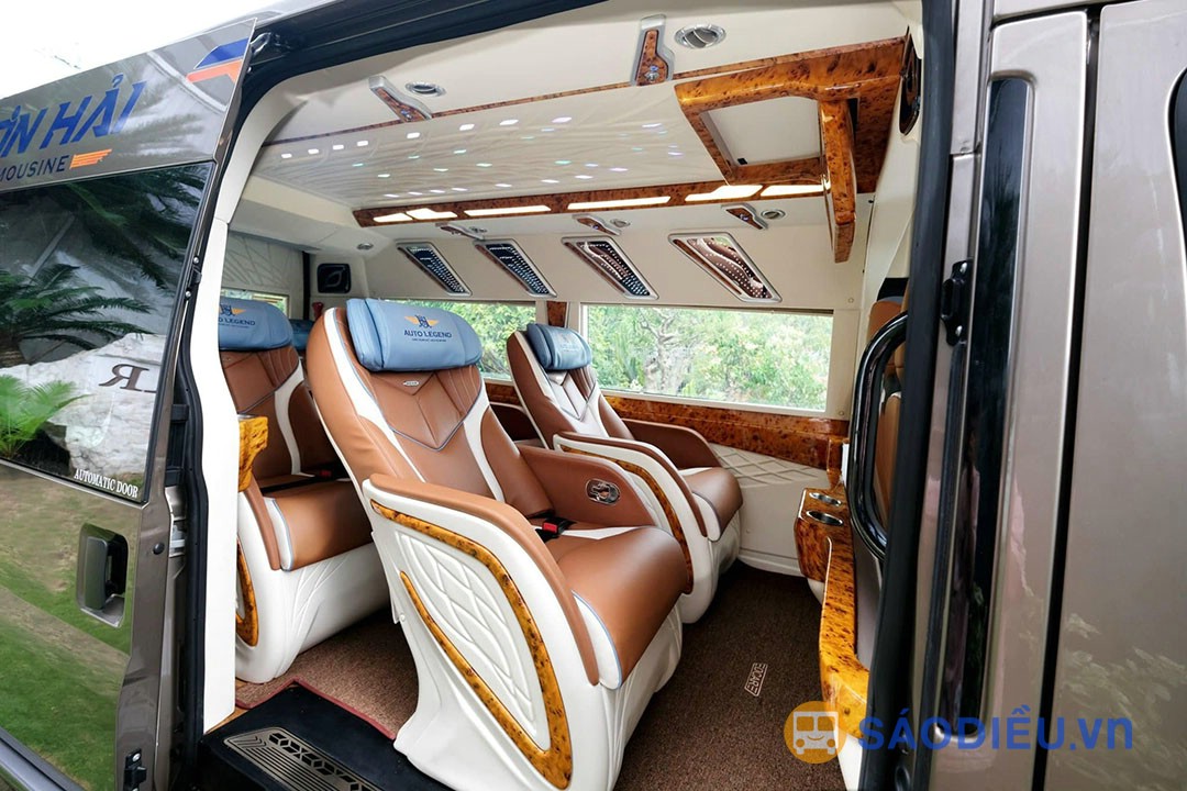 Xe Limousine Sơn Hải sử dụng đồng bộ dòng xe Limousine Dcar 9 chỗ hạng thương gia cao cấp. Xe có thiết kế 9 ghế bọc da cao cấp với không gian rộng rãi, thoáng mát. 07 ghế hạng thương gia của xe có bệ tì tay, gối đỡ chân và tựa lưng điều khiển hoàn toàn bằng điện. Nội thất của xe được ốp gỗ với rèm kéo che nắng, hệ thống đèn LED giọt nước, đèn bầu trời sao kiểu Rolls Royce sang trọng.