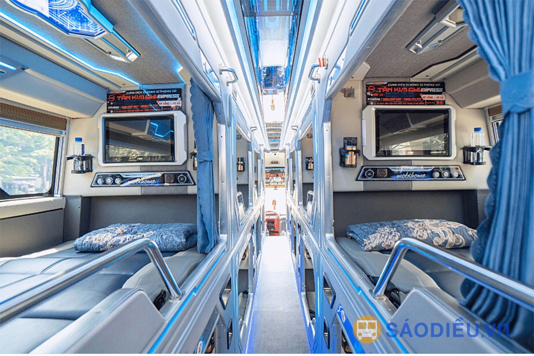 Xe Limousine giường nằm Tân Kim Chi đi Đà Nẵng là loại xe giường Limousine 34 chỗ. Xe chỉ có 34 giường thay vì 40 hay 42 giường thông thường. Mỗi giường đều có rèm che và màn hình LCD, mang lại cảm giác riêng tư, thoải mái hơn. Trên xe cũng có đầy đủ tiện nghi hiện đại như: Chăn đắp, điều hòa, tủ lạnh, tivi, wifi, cổng sạc USB, khăn lạnh và nước uống miễn phí.